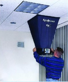 TSI 公司的ACCUBALANCE 套帽式风量罩可测定流经各种风口(散流器、百叶等)的风量。体积轻巧,仅重3.4Kg,便于携带使用。把风量罩安放在风口上,就可由数字显示屏直接读出进风或排风量。8375M 同时提供多种测量功能,并提供数据存储和处理功能(数据点多达1000点)。